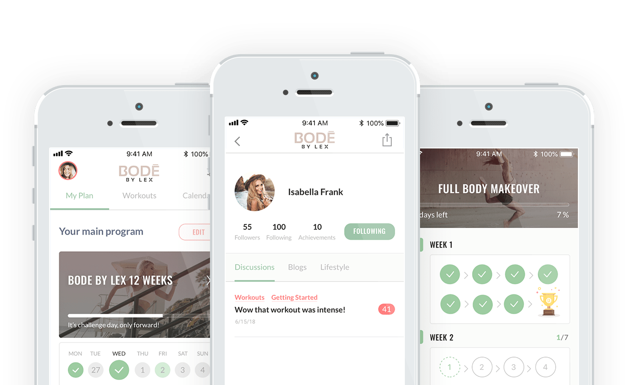 The Bode By Lex app is built to run on both the Android and Apple platforms. The app offers multi week exercise programs as well as daily fitness challenges. Achievements and leaderboard scoring allows users to track their progress. The app features Spotify integration so users can listen to their music playlists while exercising. A robust community section including private messaging, user forums and lifestyle blogs gives users the chance to connect with one another. The apps content and users are managed from a robust back-end that runs of a cloud based server. Payment for the app is done via 7 day free trial, monthly and yearly in-app purchase.