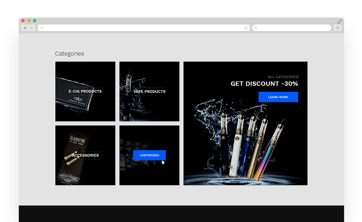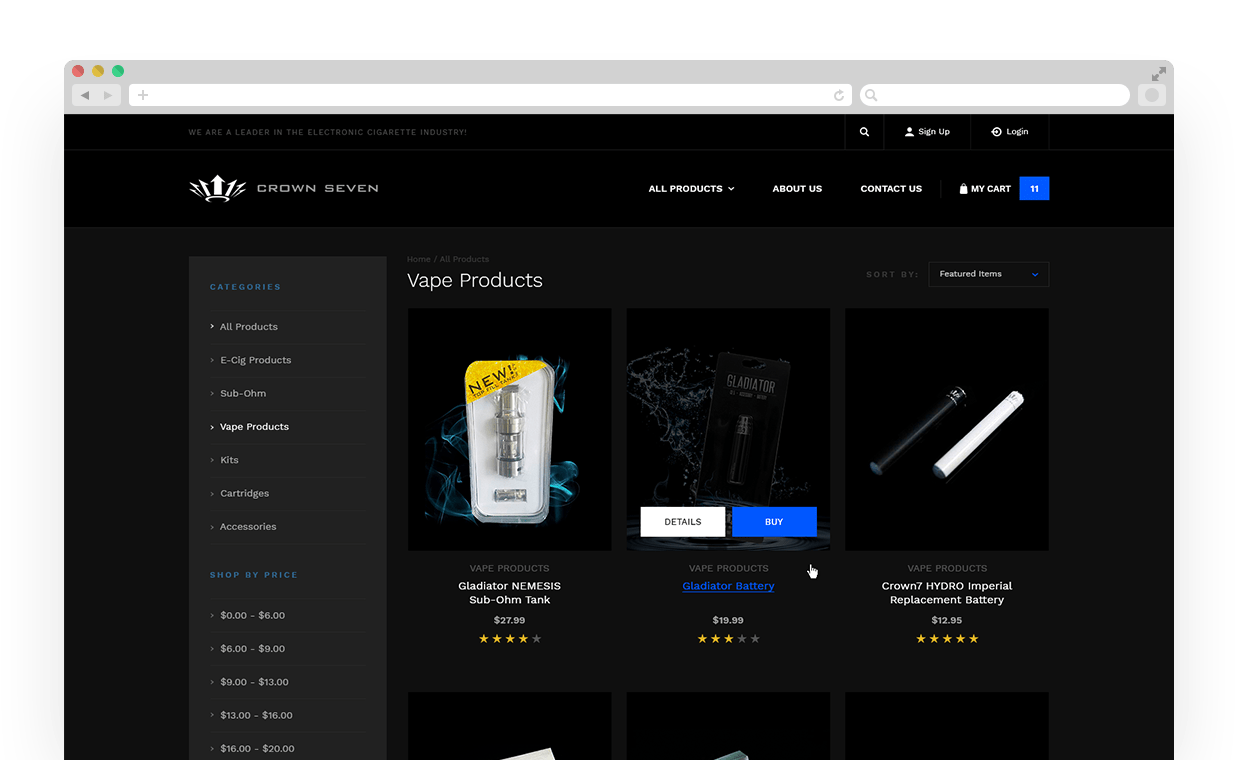 Crown7 is an industry leader in the eCig and vape industry. The Crown7.com website is built on the bigCommerce development platform and allows the administrator easy access to update site content, products and incoming online orders.