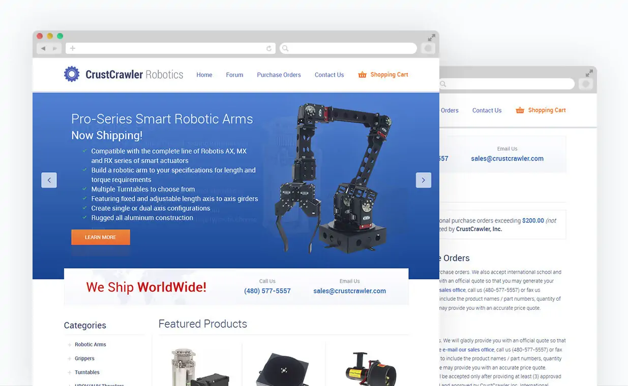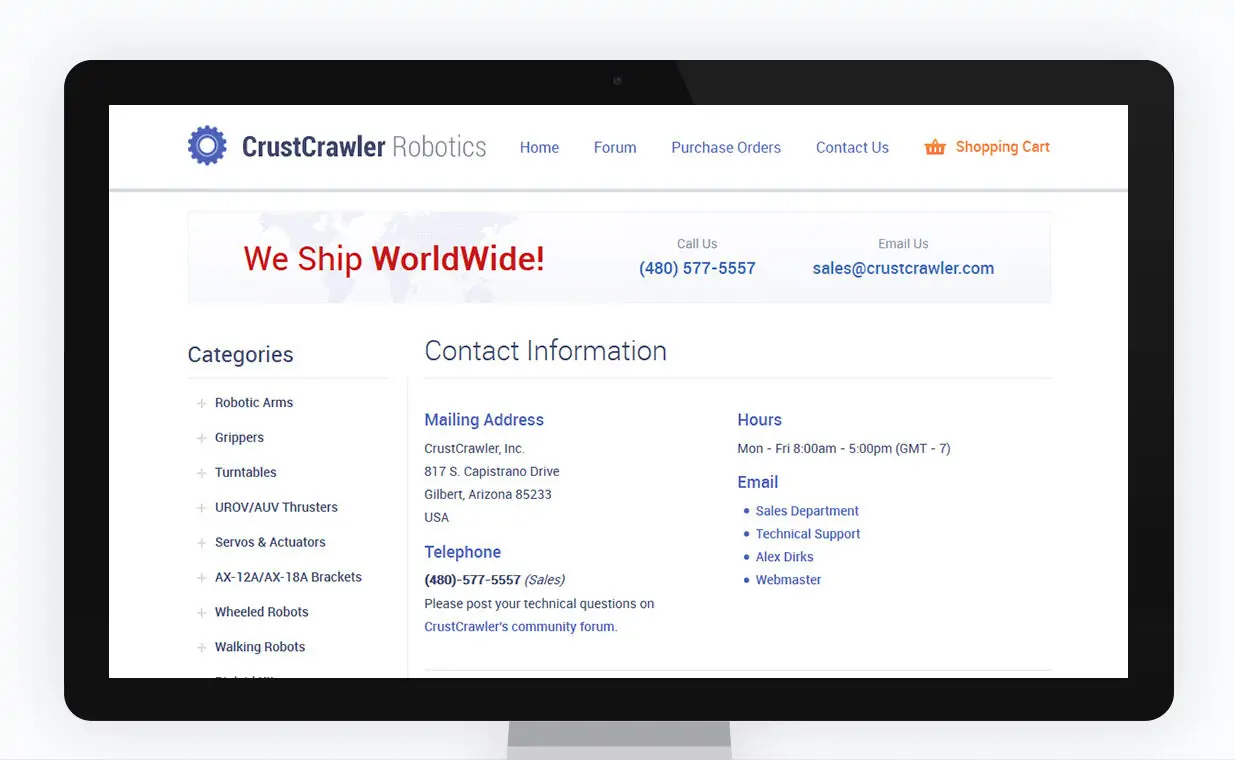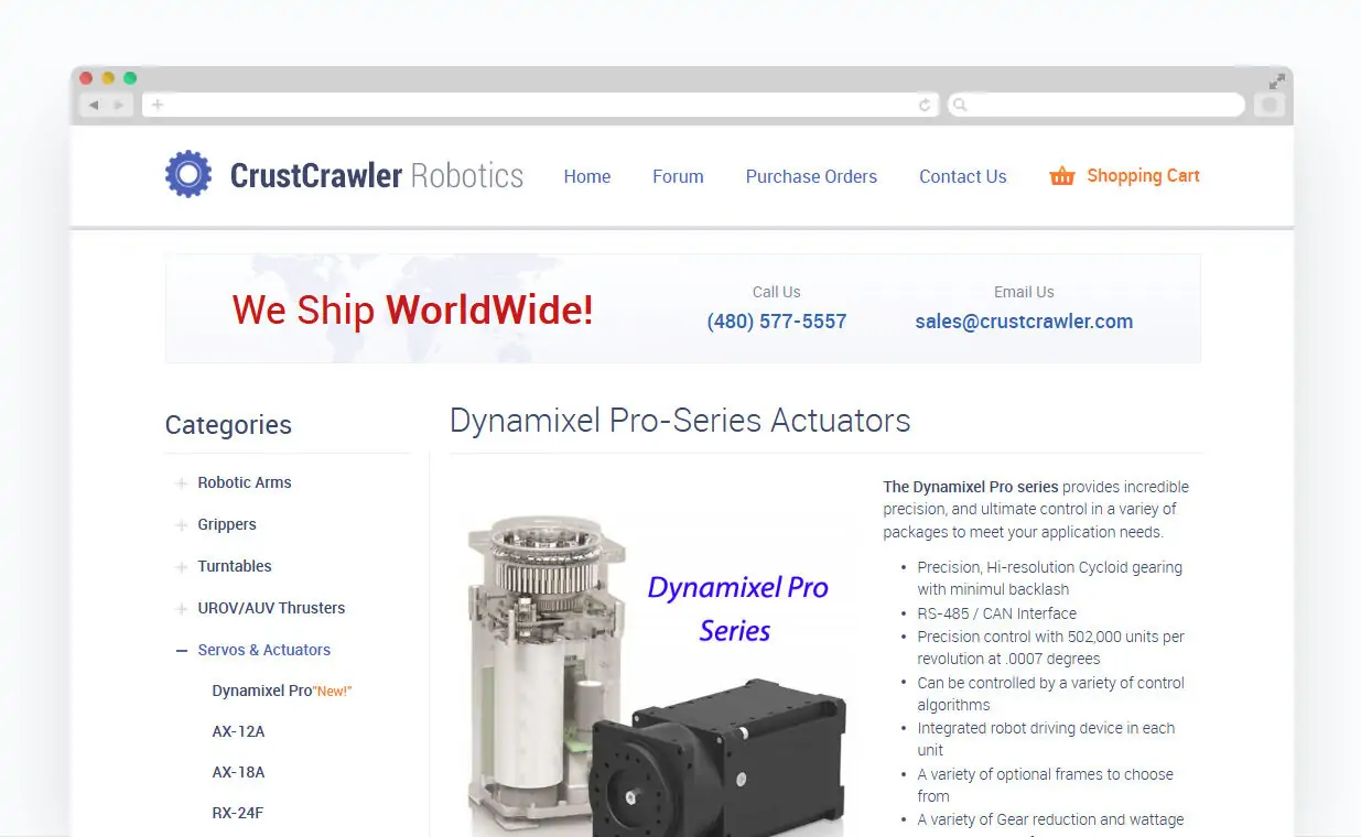 CrustCrawler is a world leader in the field of cutting edge Robotic kits, Robotic Arms, ROV/AUV Thrusters, Bioloids, and Servos. Their products have been featured on the Discovery Channel and they are used worldwide to explore marine environments.