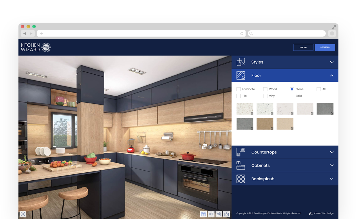 Our client Gold Canyon Kitchen & Bath wanted a way to show prospective clients what their kitchen remodel would look like post construction. Net-Craft designed a web based 3D software visualization tool that meets this requirement. In version one, users can select the initial kitchen style, cabinets, backsplash, countertops and floor. By clicking on swatch samples the three-dimensional kitchen environment is updated in real-time with the chosen style and can be panned and zoomed. Projects can be saved for later editing as well as shared via PDF or email. Users have the opportunity to create an account so that multiple projects can be saved. Future versions will add bathrooms and more kitchen styles.
