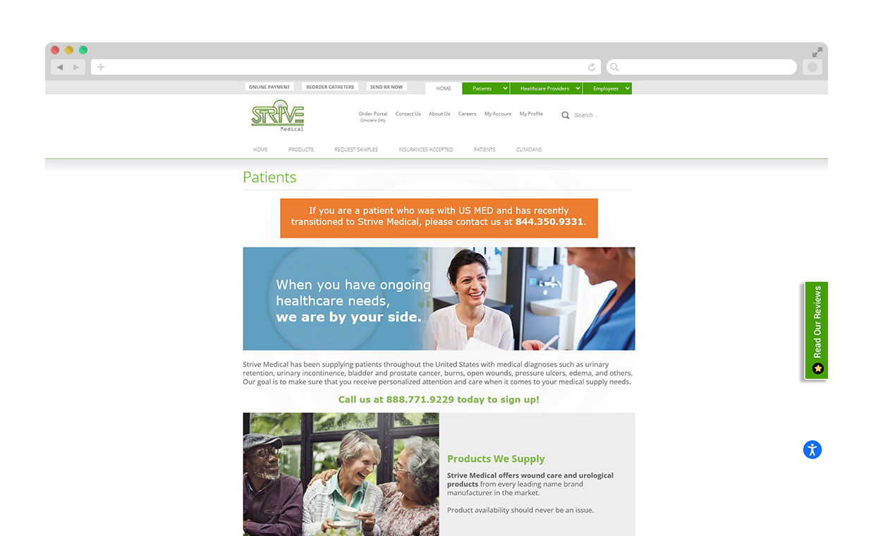 Strive is a medical supply company that provides wound care and catheter supplies directly to customers. Net-Craft designed a comprehensive website to allow employees, patients and healthcare providers access to wound care and urology needs. Patients can pay bills online and refill supplies directly online. The goal was to offer a more responsive web presence for their audience.