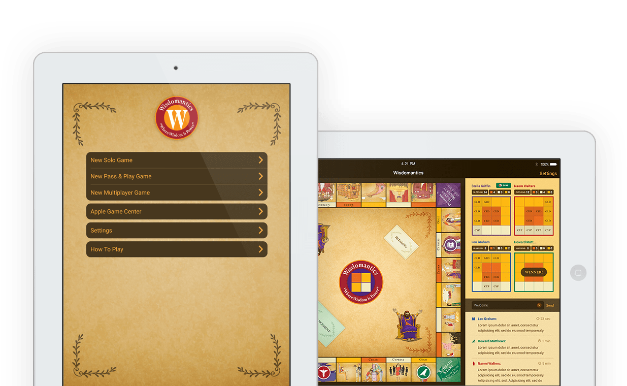 The Wisdomantic game can be played against an AI (artificial intelligence) opponent, pass & play with a friend or online with multiplayer functionality.