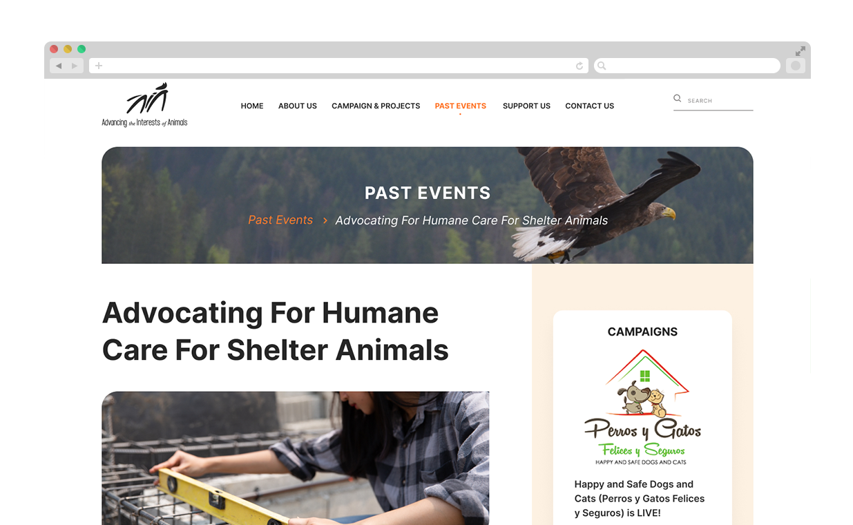 The Advancing the Interest of Animals web site is built on the WordPress platform. To meet our clients requirements we built custom WordPress plugins for the Stripe online donation functionality as well as YouTube integration. We provide monthly WordPress hosting, support, security, nightly backups and database optimization services