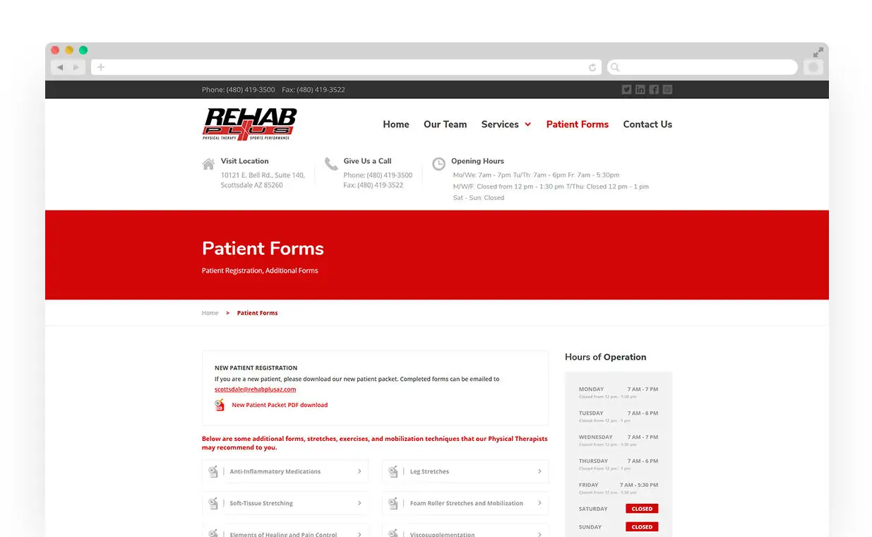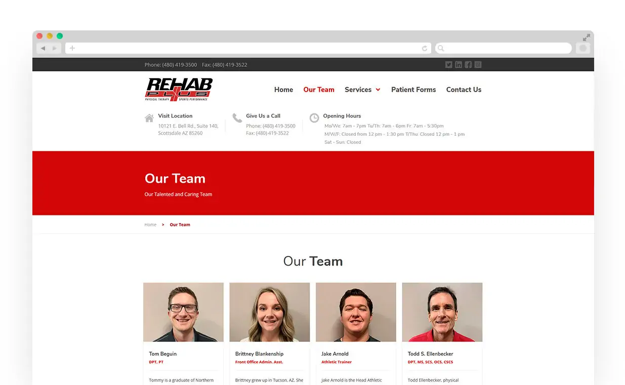 The Scottsdale location of Rehab Plus Physical Therapy offers orthopedic rehab, wellness and sports performance training. The customized WordPress website offers an easy to use portal where potential customers can access detailed service offerings, patient forms and contact information.