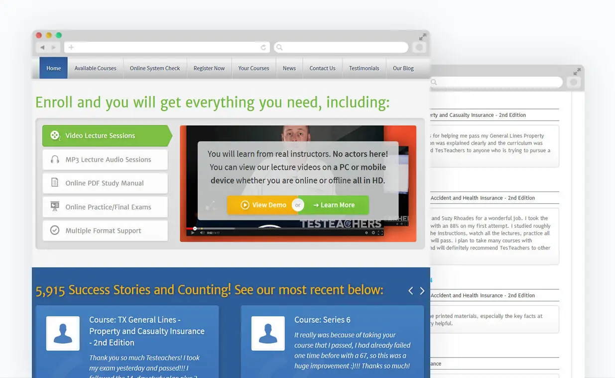 TesTeachers is the first school in the nation to provide prospective licensees with an exact replication of a true classroom experience utilizing online video lecture courses. Online programs include a combination of video classroom instruction, textbook material, practice examinations, and an interactive online Final Exam.